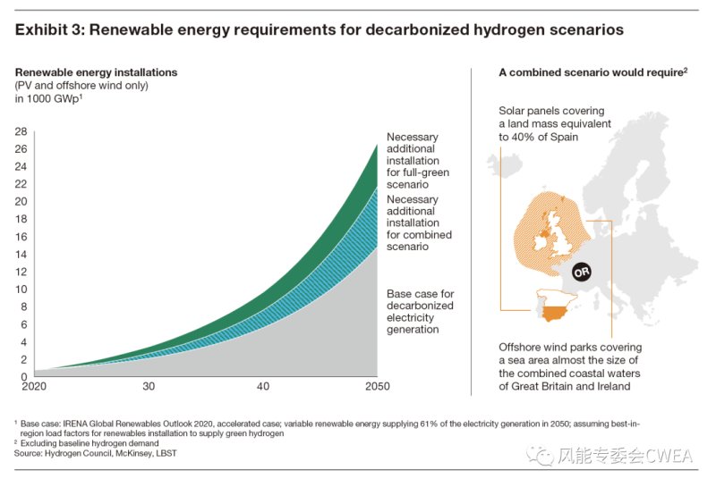 氫脫碳情景下可再生能源需求情況(混合模式下,用太陽能的話面積相當(dāng)于40%西班牙國(guó)土面積,用海上風(fēng)電則需要在英國(guó)和愛爾蘭海域全部安裝上風(fēng)機(jī))