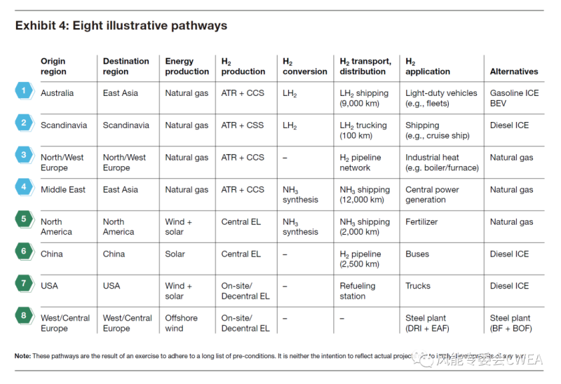報(bào)告從一次能源到氫能過程選擇了8個(gè)價(jià)值鏈進(jìn)行說明。