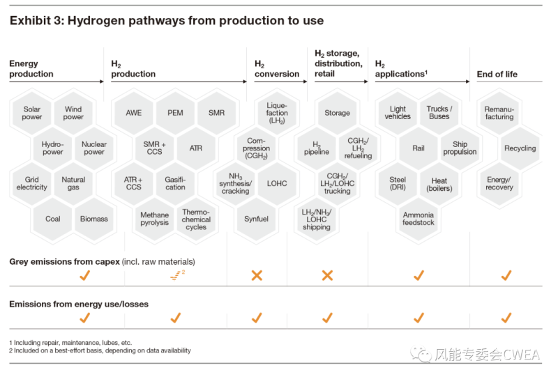 從生產(chǎn)到使用的氫能路徑,6個(gè)過程各種具體形式