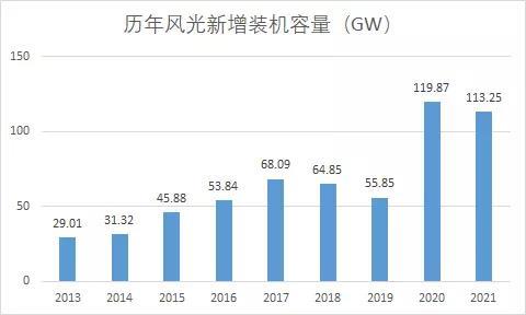 雖然這個數(shù)字略低于去年的1.2億千瓦,但完全稱不上顯著下滑,若拋去2020年的搶裝影響,2021年風光新增裝機可以說大幅增長。