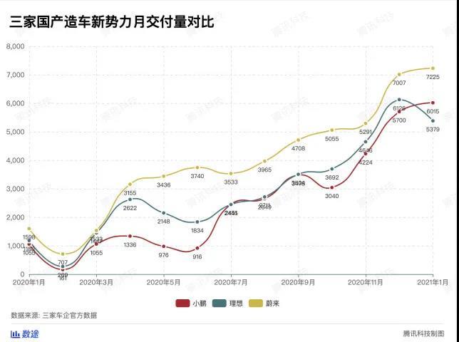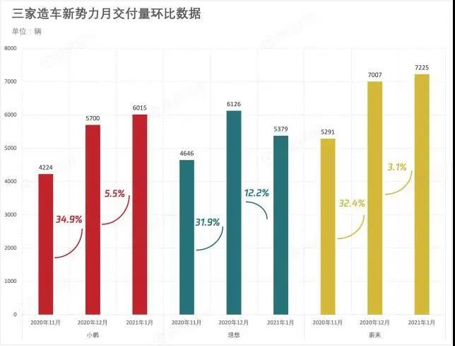 根據(jù)三家車企官方數(shù)據(jù)顯示,2021年1月,三家車企中交付量最高的依然是蔚來,1月交付了7225輛車;小鵬交付6015輛汽車,位列第二;理想汽車交付了5379輛車,盡管依然是單一車型交付冠軍,但環(huán)比增速在三家里是唯一負(fù)增長的。