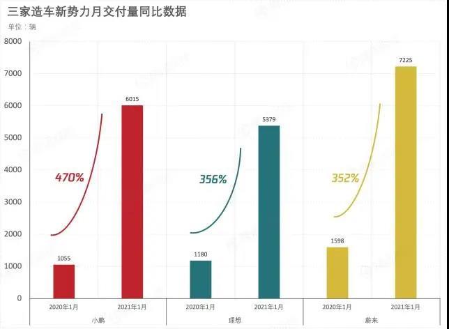 中國儲能網(wǎng)訊:剛剛進入2月,小鵬、理想和蔚來三家造車新勢力就相繼發(fā)布了2021年1月的新車整體交付量數(shù)據(jù)。三家車企同比增速均超過了350%,其中小鵬汽車的增速甚至高達(dá)470%。