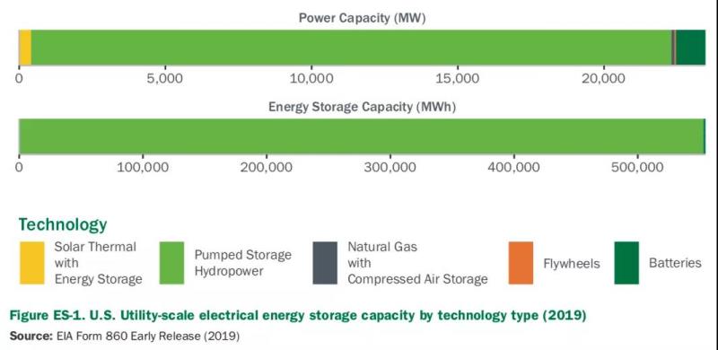 抽水蓄能系統(tǒng)占美國電網(wǎng)蓄能容量的93%,其增長速度幾乎與所有其他蓄能技術(shù)的總和一樣快。2019年,43座抽水蓄能發(fā)電廠的總裝機容量為21.9吉瓦,儲能容量為553吉瓦時,占公用事業(yè)規(guī)模儲能容量(GW)的93%,占電能儲存(GWh)的99%以上。從2010年到2019年,抽水蓄能的新增裝機容量(1333MW)接近美國所有其他形式的儲能裝機容量(1675MW)增量。