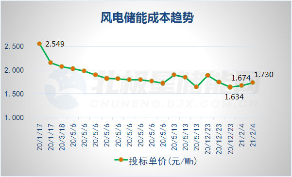 據(jù)北極星儲能網(wǎng)統(tǒng)計,自2020年1月到現(xiàn)在已有7個風電儲能項目公開投標價格,在2020年風電配套儲能工程成本單價從最高2.549元/Wh,降到了最低1.634元/Wh,降幅達到36%。此次開標的國華竹根沙海上風電儲能電站工程,是國內(nèi)首個海上風電配套儲能項目,兩家中標候選人的報價成本與2020年的陸上風電配套儲能成本最低價非常接近。