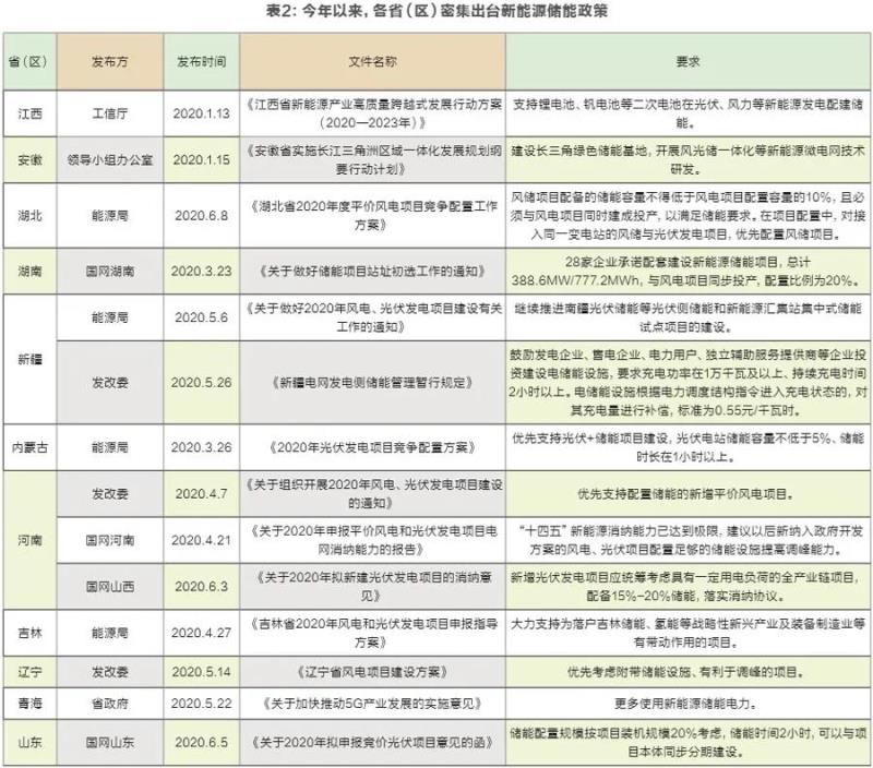 今年上半年,湖北、湖南、新疆、內(nèi)蒙古、山西、山東等省(區(qū))相繼發(fā)布政策,優(yōu)先支持或要求新建風(fēng)電和光伏項(xiàng)目配備儲能,儲能配置比例在5%~20%之間,儲能時長為1-2小時。
