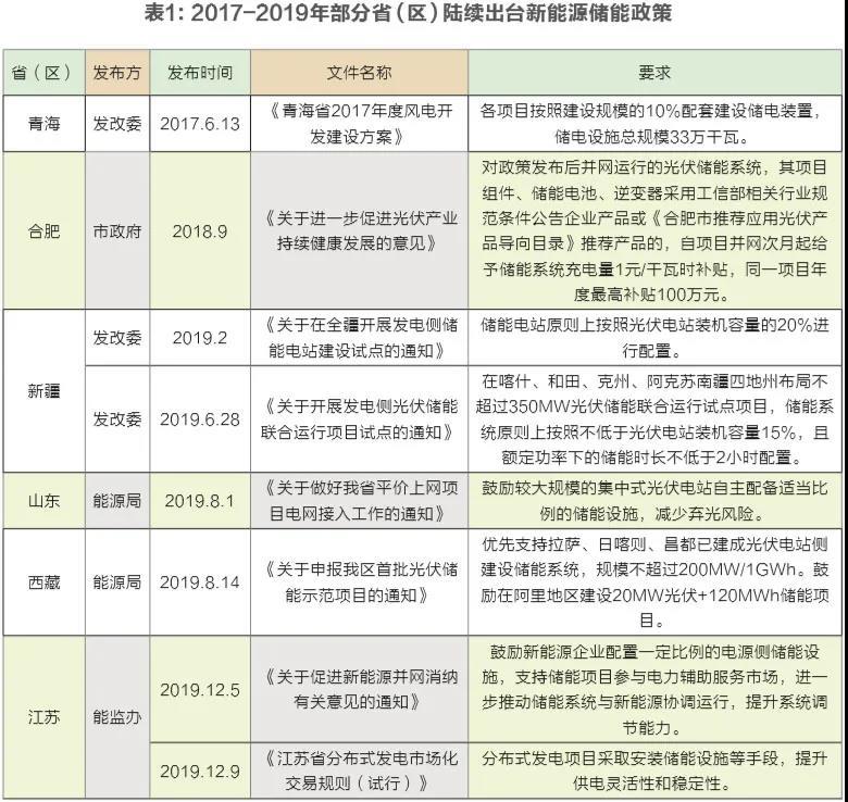 新能源配儲能并不是新鮮事物。早在2017年,青海省發(fā)改委便在《2017年度風(fēng)電開發(fā)建設(shè)方案》中提出,列入青海省2017年度風(fēng)電開發(fā)建設(shè)方案的43個項(xiàng)目按照建設(shè)規(guī)模的10%配套建設(shè)儲電裝置,儲電設(shè)施總規(guī)模0.33GW。2019年,新疆、山東、西藏、江蘇等?。▍^(qū))也陸續(xù)出臺政策,鼓勵或要求新能源項(xiàng)目配備儲能設(shè)施。(見表1)