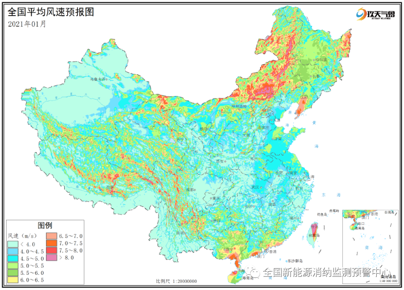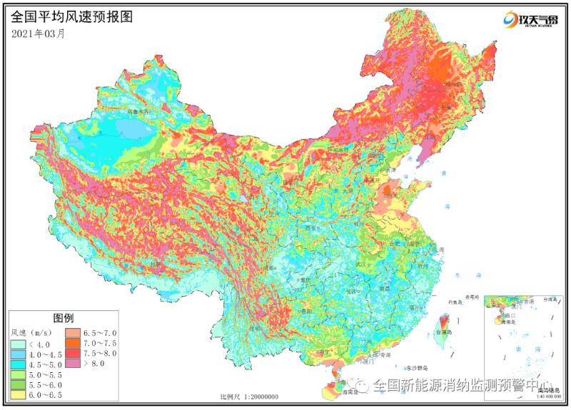 根據(jù)中國氣象局預(yù)測(cè),風(fēng)能資源方面,2021年一季度隨著月份遞增,全國大部地區(qū)風(fēng)速呈增大趨勢(shì),風(fēng)速在3.6m/s~7.2m/s之間。風(fēng)速低值區(qū)一般位于新疆西部和中部、西藏南部、西南地區(qū)東北部和南部等地,平均風(fēng)速一般低于4.0m/s;風(fēng)速高值區(qū)主要位于東北、西北東部的部分地區(qū)、青藏高原、川西高原、云貴高原等地,平均風(fēng)速達(dá)到6.0m/s以上。