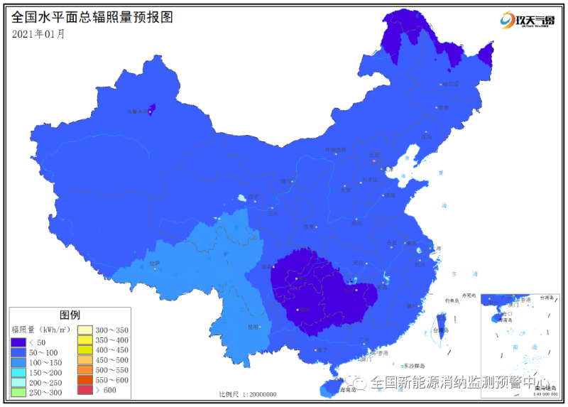 附圖2 全國2021年1月水平面總輻照量預(yù)報(bào)圖