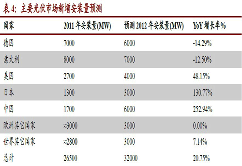 中國儲能網(wǎng)訊:自11年開始,歐債危機嚴(yán)重影響了光伏市場,大量的削減光伏補貼。下面是宏源證券研究所對主要光伏市場做的數(shù)據(jù)分析,有關(guān)12年主要光伏市場新增安裝量預(yù)測,僅供參考。