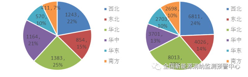 四季度各區(qū)域新增(左)、累計(右)并網(wǎng)光伏發(fā)電裝機(jī)(萬千瓦)