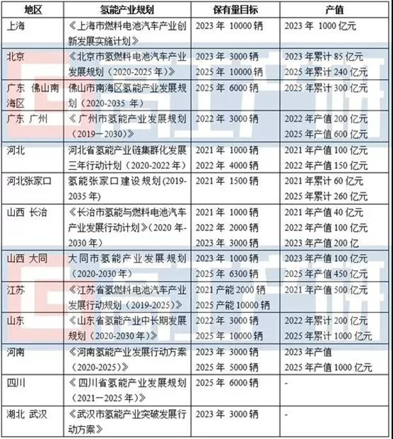 具體來看,據(jù)不完全統(tǒng)計,僅上海、北京、廣東、山西、山東、江蘇、河北、河南、四川、湖北等十個省份及直轄市明確規(guī)劃(如下圖所示),2023/2025年燃料電池汽車保有量分別達(dá)到3.5萬輛和7.63萬輛。2020年底國內(nèi)燃料電池汽車保有量在8000輛左右,這意味著未來三年年均銷量需達(dá)到9000輛以上,未來五年年均銷量在13660輛以上。