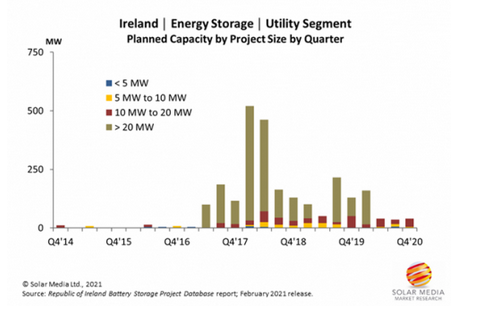 上圖顯示了在過去幾年中,愛爾蘭的電網(wǎng)規(guī)模電池儲(chǔ)能項(xiàng)目的管道增長25%。第一個(gè)電網(wǎng)規(guī)模的電池儲(chǔ)能項(xiàng)目(高于20MW)于2017年提交部署規(guī)劃。