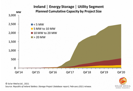 到2020年底,愛爾蘭計(jì)劃部署的電網(wǎng)規(guī)模電池儲(chǔ)能裝機(jī)容量超過2.5GW,其中大部分是裝機(jī)容量為20MW以上大型電池儲(chǔ)能系統(tǒng)。