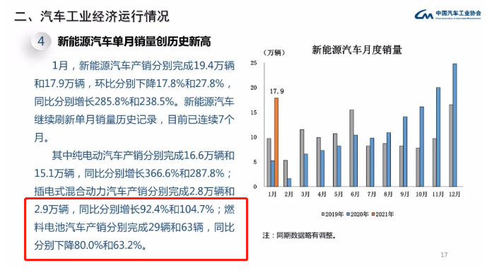 從中汽協(xié)官方獲悉,中國汽車工業(yè)協(xié)會發(fā)布2021年1月汽車產(chǎn)銷數(shù)據(jù),燃料電池汽車產(chǎn)銷分別完成29輛和63輛,同比分別下降80.0%和63.2%。