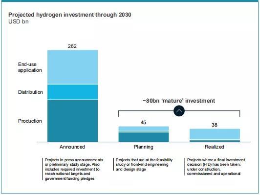 《報告》顯示,如果已公布的所有項目都建成,到2030年,氫能投資總額將達到3000多億美元。在這些投資中,有800億美元的項目目前可被視為“成熟”項目,即這些項目正處于規(guī)劃階段,已通過最終投資決策(FID),部分項目正在建設、已投產或已投入運營。