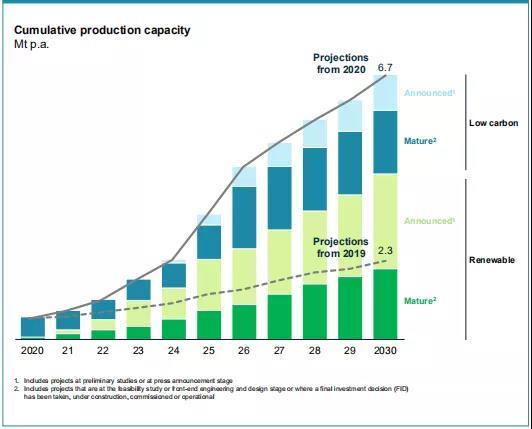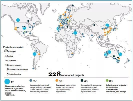 根據《報告》,在整個價值鏈上,已公布的大型項目不少于228個,其中85%位于歐洲、亞洲和澳大利亞,這些項目涉及大規(guī)模工業(yè)應用、運輸應用、綜合氫能經濟、基礎設施等方面。從目前已宣布的氫項目來看,2030年綠氫產能預期將從去年的230萬噸增加到670萬噸/年,也就是,目前已宣布項目的綠氫產能中,有2/3來自2020年。