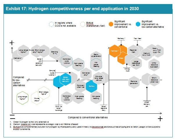 從總體擁有成本(TCO)的角度(包括制氫、分銷和零售成本)來看,氫能是22種終端應(yīng)用中最具競爭力的低碳解決方案,包括長途卡車運(yùn)輸、航運(yùn)和鋼鐵。然而,純TCO并不是唯一驅(qū)動因素:未來對環(huán)境法規(guī)的期望、客戶的需求和相關(guān)的“綠色溢價(jià)”,以及ESG合規(guī)投資的較低資本成本都將影響投資和購買決策。