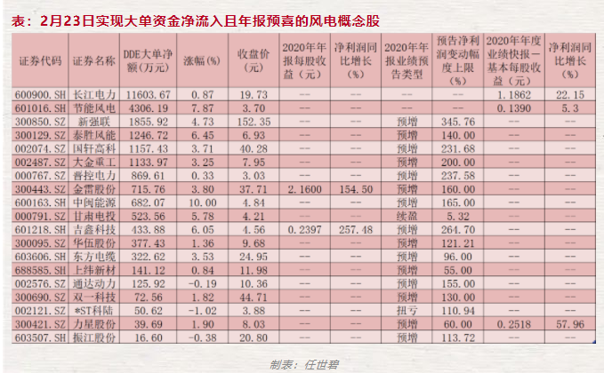 值得一提的是,目前市場做多資金也紛紛涌入風(fēng)電績優(yōu)股進(jìn)行布局?!蹲C券日報(bào)》記者根據(jù)同花順數(shù)據(jù)統(tǒng)計(jì)發(fā)現(xiàn),2月23日,板塊內(nèi)共有33只風(fēng)電概念股呈現(xiàn)大單資金凈流入態(tài)勢。其中,有19只年報(bào)預(yù)喜股備受大單資金的青睞,合計(jì)吸金2.57億元。長江電力、節(jié)能風(fēng)電、新強(qiáng)聯(lián)、泰勝風(fēng)能、國軒高科、大金重工等6只年報(bào)預(yù)喜股大單資金凈流入均在千萬元以上,包括晉控電力、金雷股份、中閩能源、甘肅電投等在內(nèi)的13只年報(bào)預(yù)喜股當(dāng)日也獲大單資金追捧,后市表現(xiàn)值得期待。