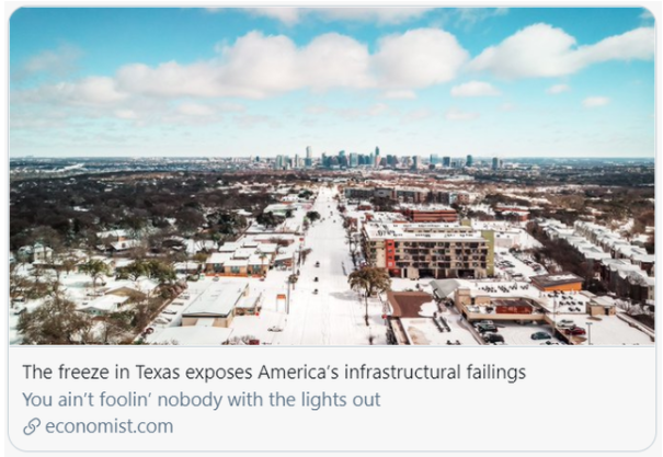 得州冰凍暴露了美國基礎(chǔ)設(shè)施的缺陷。/《經(jīng)濟學(xué)人》報道截圖