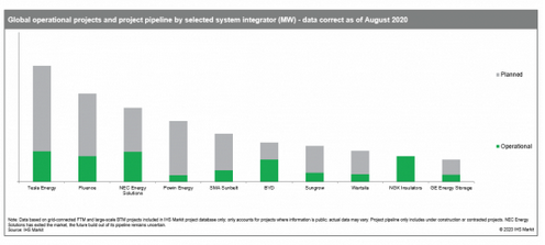 在全球范圍內,特斯拉、NEC Energy Solutions和Fluence公司一直是行業(yè)領先的儲能系統(tǒng)集成商。儲能系統(tǒng)集成商的未來市場格局將會進一步多樣化,這主要是由儲能逆變器制造商擴大其業(yè)務范圍(針對太陽能+儲能應用)以及現有的競爭對手(例如如瓦錫蘭和Powin Energy)致力發(fā)展帶來的戰(zhàn)略機遇。與此同時,NEC Energy Solutions公司最近退出儲能市場也說明了儲能市場出現整合的趨勢,特別是對規(guī)模較小的區(qū)域性參與者來說,面臨整合的挑戰(zhàn)。主要的儲能系統(tǒng)集成商的業(yè)務正在轉向全球化,并可以根據其運營規(guī)模提供更具成本效益的解決方案。圖2概述了部分儲能系統(tǒng)集成商當前已經部署的儲能系統(tǒng)和計劃部署的儲能項目(數據來自截至2020年8月的IHS Markit公司全球儲能項目數據庫)。