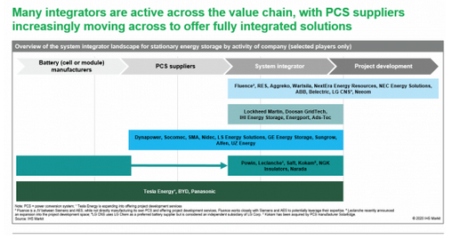 研究表明,儲能市場的競爭格局正在變得多元化。由于大量的項目管道使現有的部署規(guī)模相形見絀,儲能逆變器(PCS)制造商正在擴展針對太陽能發(fā)電設施和儲能應用的業(yè)務,而新進入市場的儲能集成商正在挑戰(zhàn)現有的集成商。如圖1所示,在儲能價值鏈的各個細分市場中活躍著許多參與者,尤其是逆變頻制造商紛紛轉向提供完全集成的儲能解決方案。