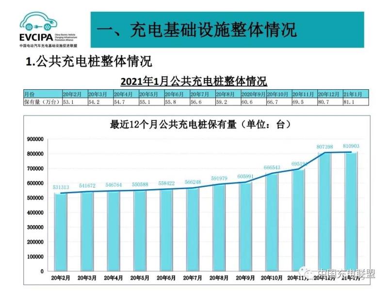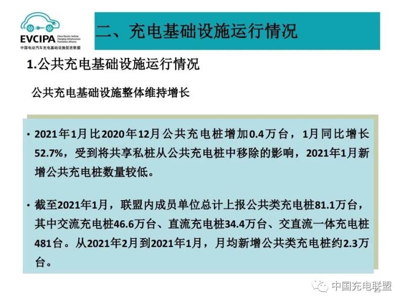 中國儲能網(wǎng)訊:公共充電基礎(chǔ)設(shè)施運行情況,2021年1月比2020年12月公共充電樁增加0.4萬臺,1月同比增長52.7%,受到將共享私樁從公共充電樁中移除的影響,2021年1月新增公共充電樁數(shù)量較低。截至2021年1月,聯(lián)盟內(nèi)成員單位總計上報公共類充電樁81.1萬臺,其中交流充電樁46.6萬臺、直流充電樁34.4萬臺、交直流一體充電樁481臺。從2021年2月到2021年1月,月均新增公共類充電樁約2.3萬臺。