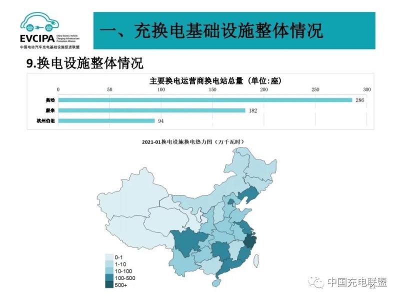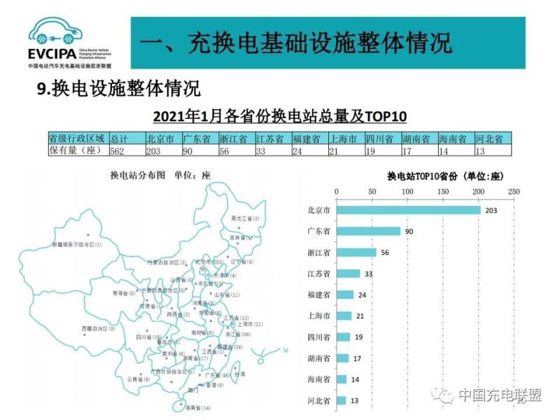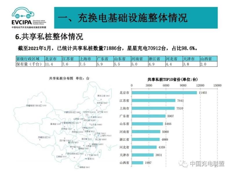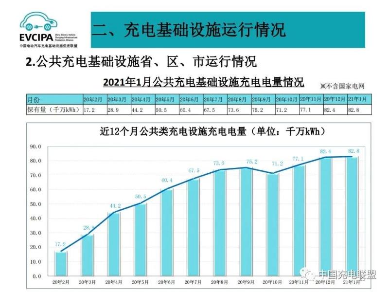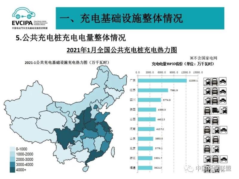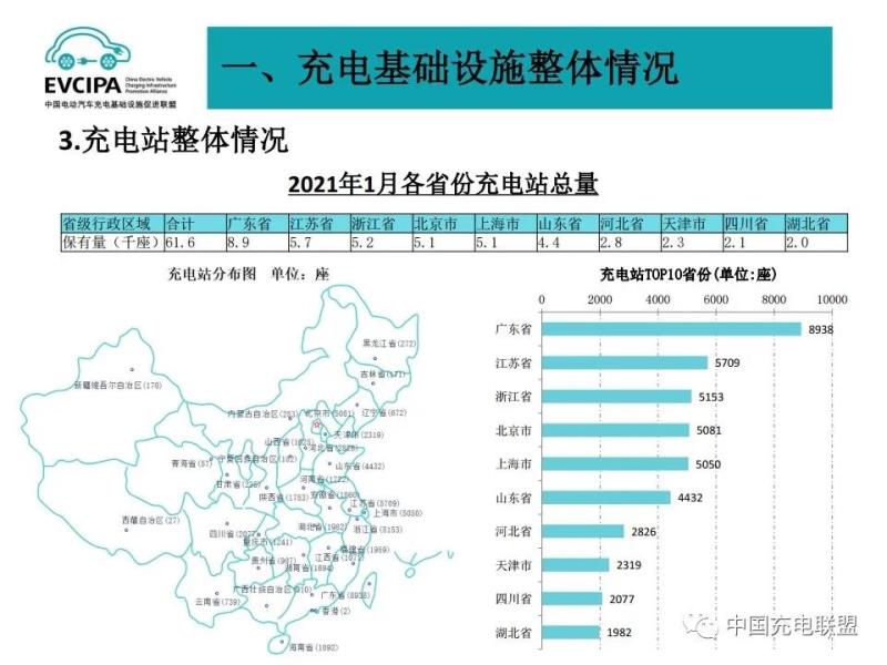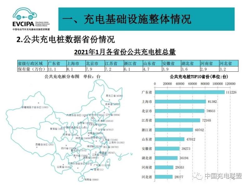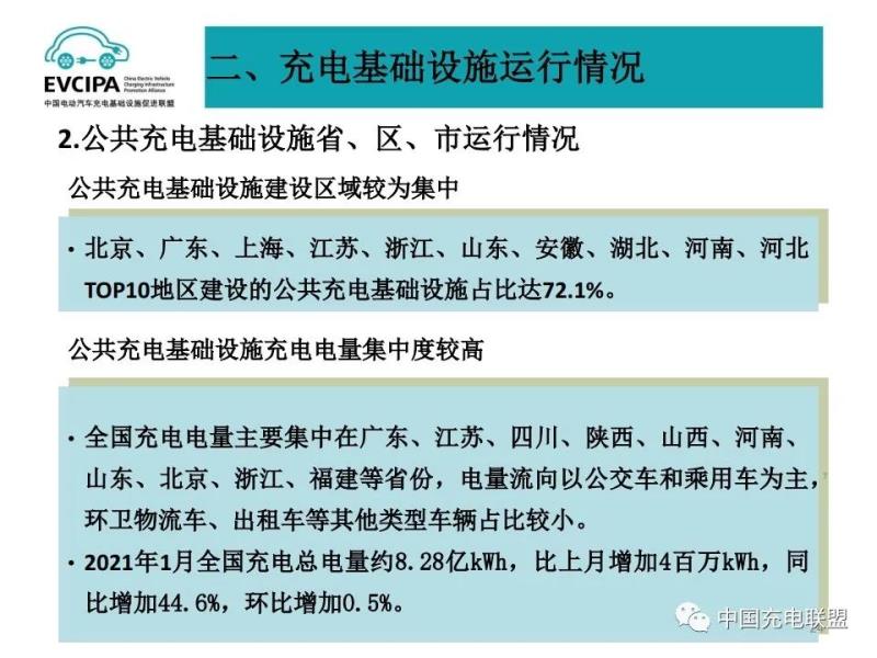 公共充電基礎(chǔ)設(shè)施省、區(qū)、市運行情況,北京、廣東、上海、江蘇、浙江、山東、安徽、湖北、河南、河北TOP10地區(qū)建設(shè)的公共充電基礎(chǔ)設(shè)施占比達(dá)72.1%。全國充電電量主要集中在廣東、江蘇、四川、陜西、山西、河南、山東、北京、浙江、福建等省份,電量流向以公交車和乘用車為主,環(huán)衛(wèi)物流車、出租車等其他類型車輛占比較小。2021年1月全國充電總電量約8.28億kWh,比上月增加4百萬kWh,同比增加44.6%,環(huán)比增加0.5%。