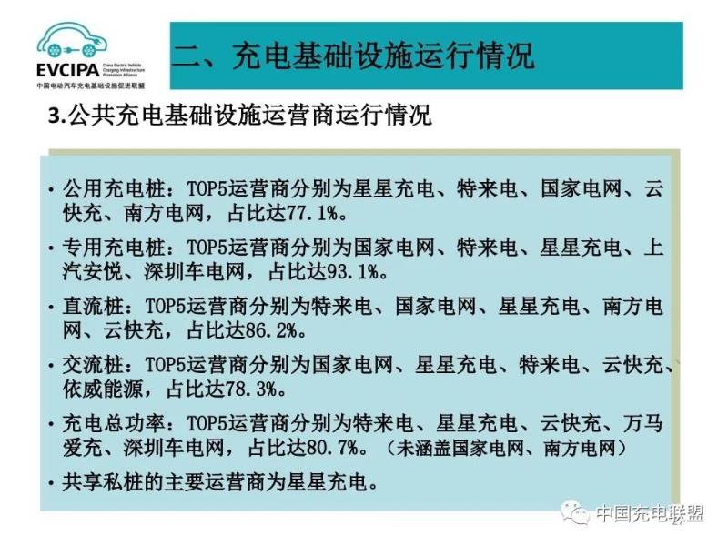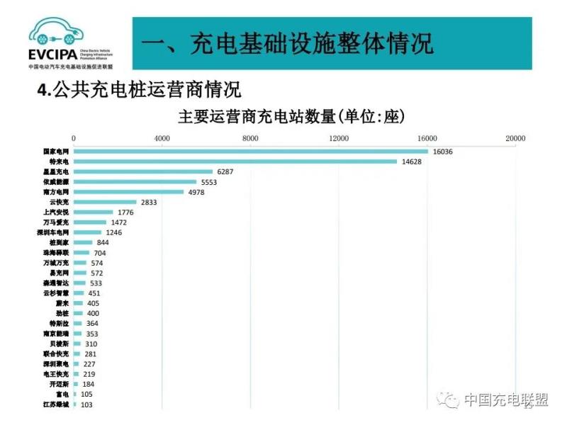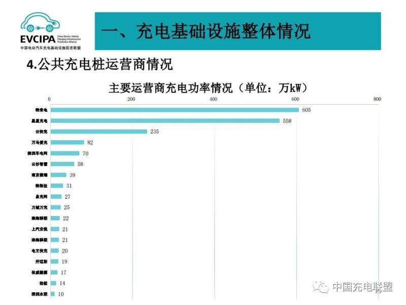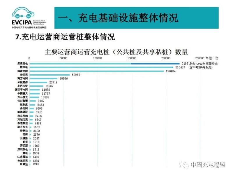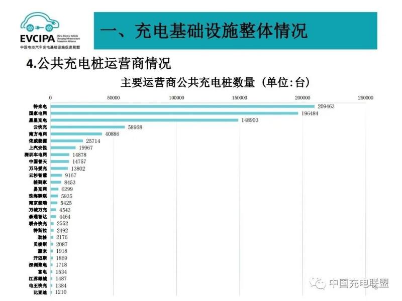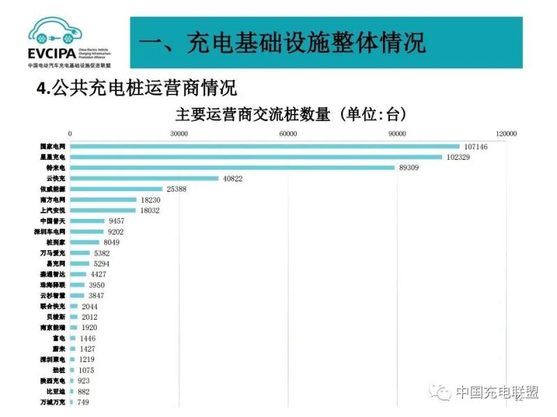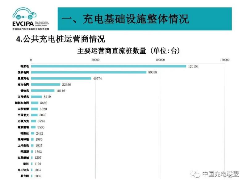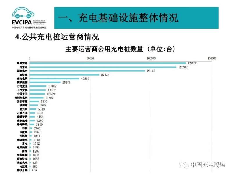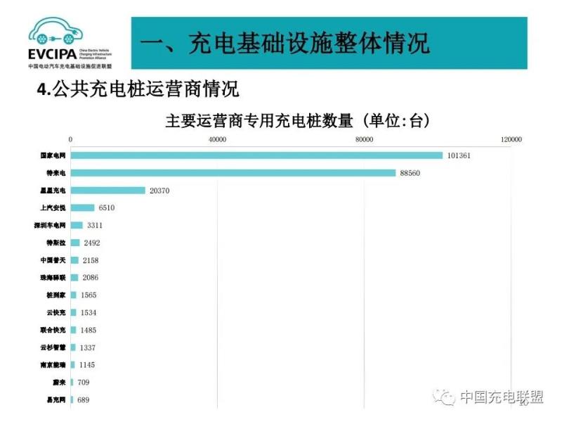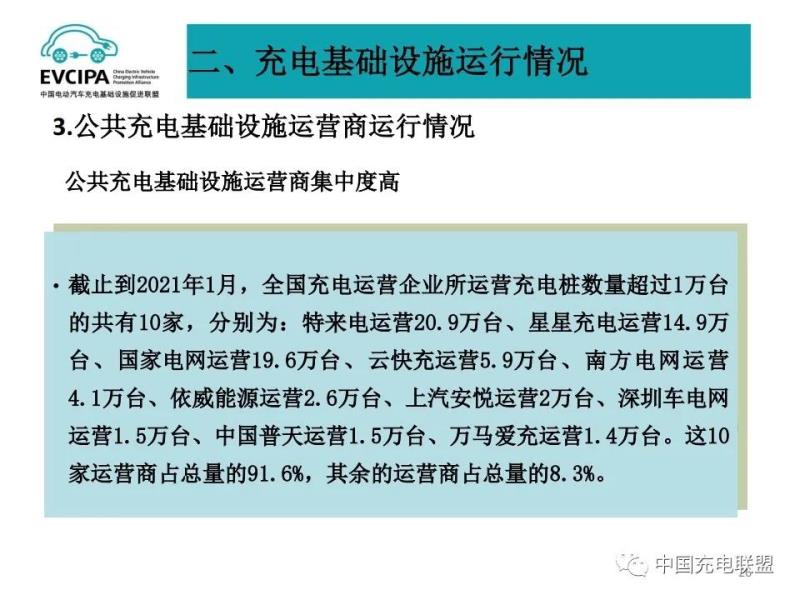 公共充電基礎(chǔ)設(shè)施運營商運行情況,截止到2021年1月,全國充電運營企業(yè)所運營充電樁數(shù)量超過1萬臺的共有10家,分別為:特來電運營20.9萬臺、星星充電運營14.9萬臺、國家電網(wǎng)運營19.6萬臺、云快充運營5.9萬臺、南方電網(wǎng)運營4.1萬臺、依威能源運營2.6萬臺、上汽安悅運營2萬臺、深圳車電網(wǎng)運營1.5萬臺、中國普天運營1.5萬臺、萬馬愛充運營1.4萬臺。這10家運營商占總量的91.6%,其余的運營商占總量的8.3%。