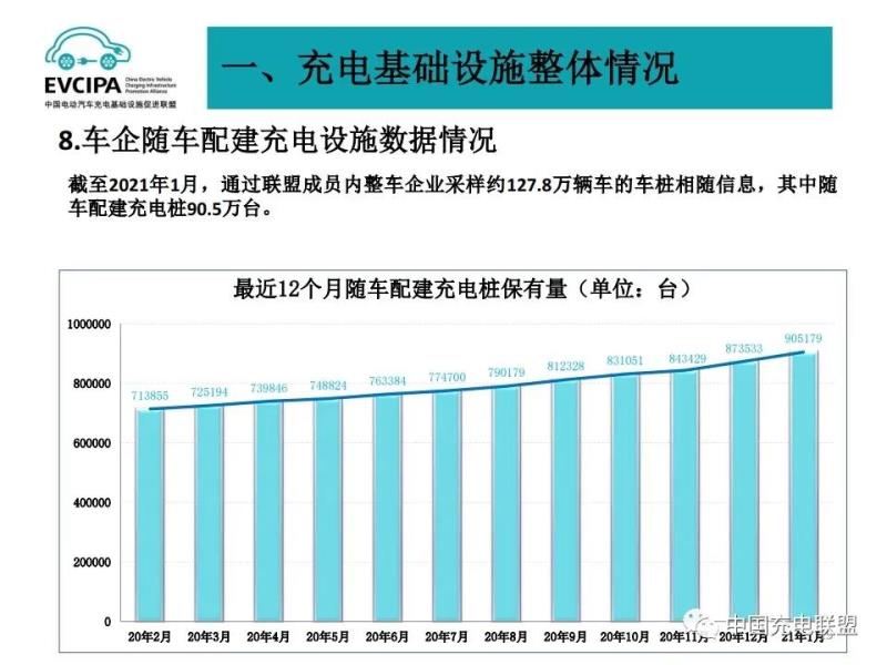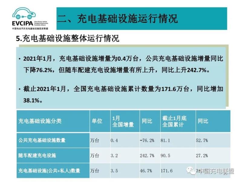 充電基礎(chǔ)設(shè)施整體運行情況,2021年1月,充電基礎(chǔ)設(shè)施增量為0.4萬臺,公共充電基礎(chǔ)設(shè)施增量同比下降76.2%,但隨車配建充電設(shè)施增量有所上升,同比上升242.7%。截止2021年1月,全國充電基礎(chǔ)設(shè)施累計數(shù)量為171.6萬臺,同比增加38.1%。
