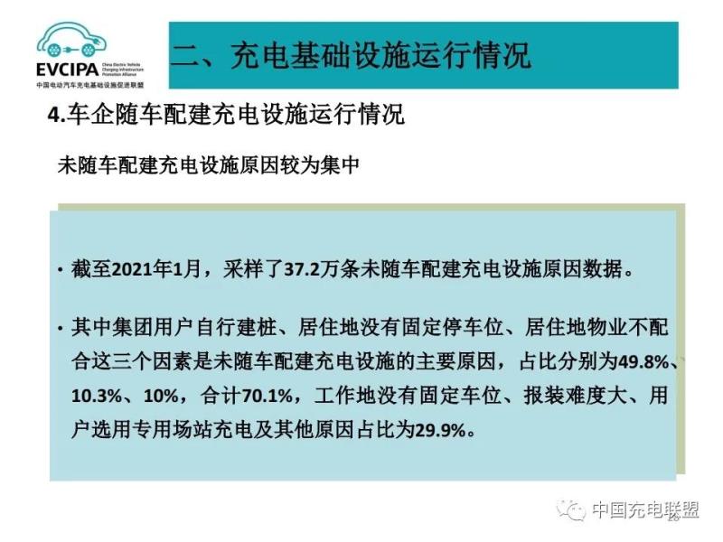 車企隨車配建充電設(shè)施運行情況,截至2021年1月,采樣了37.2萬條未隨車配建充電設(shè)施原因數(shù)據(jù)。其中集團(tuán)用戶自行建樁、居住地沒有固定停車位、居住地物業(yè)不配合這三個因素是未隨車配建充電設(shè)施的主要原因,占比分別為49.8%、10.3%、10%,合計70.1%,工作地沒有固定車位、報裝難度大、用戶選用專用場站充電及其他原因占比為29.9%。