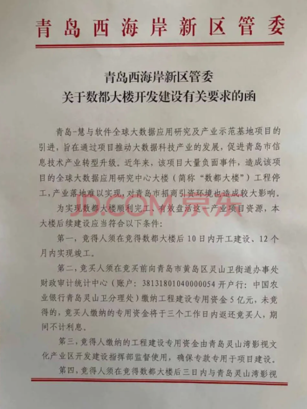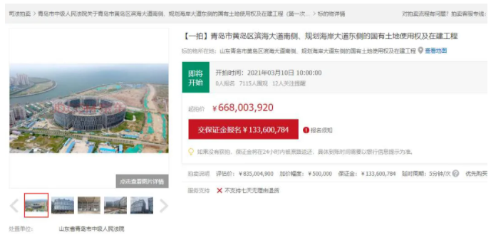 從現(xiàn)場照片看,建筑主體已基本完工。而此次拍賣目的也為青島西海岸新區(qū)管委為繼續(xù)完成“中國數(shù)都”項目,盤活資產而進行。