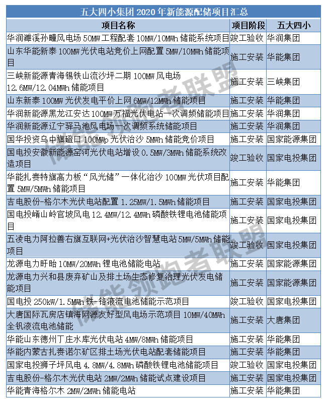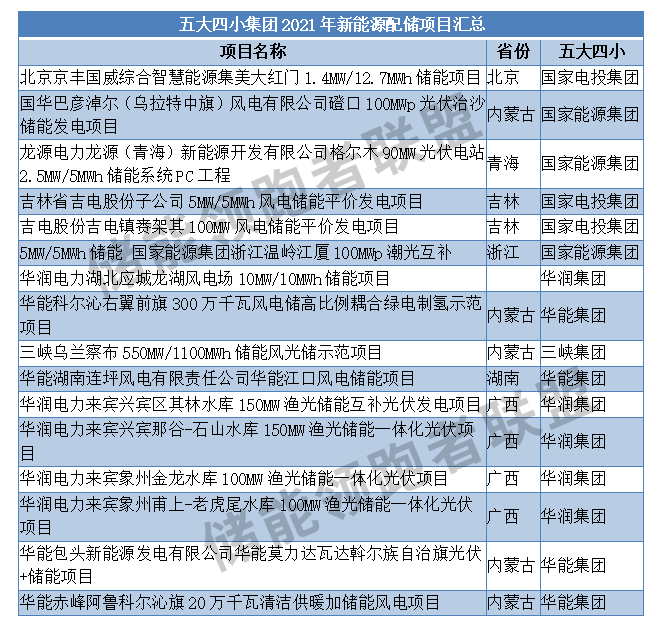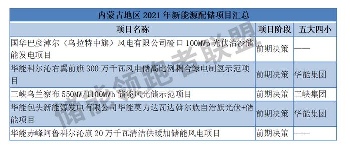 2021年截至今日,五大四小集團已有16個新能源配儲項目處于前期規(guī)劃當中,約占2020全年五大四小集團投建新能源配儲項目總個數(shù)的42%。如上文提到的三峽烏蘭察布新一代電網(wǎng)友好綠色電站示范項目、華潤電力湖北應(yīng)城龍湖風電場10MW/10MWh儲能項目等,都是最新發(fā)布的項目。