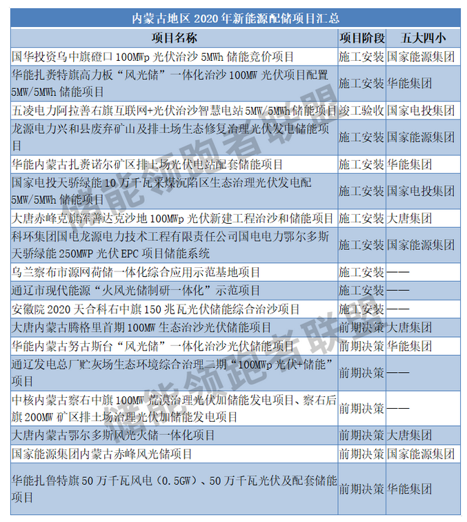 在2020年時,內(nèi)蒙古地區(qū)新能源配儲項目個數(shù)已名列全國第一,共有18個,其中包含1個已竣工驗收的項目,即五凌電力阿拉善右旗互聯(lián)網(wǎng)+光伏治沙智慧電站5MW/5MWh儲能項目,10個正在施工安裝的項目,7個還處于前期規(guī)劃中的項目。這18個儲能項目里,有13個是“五大四小”集團投建,其中國家能源集團、華能集團、大唐集團、國家電投集團分別有4個、4個、3個、2個。
