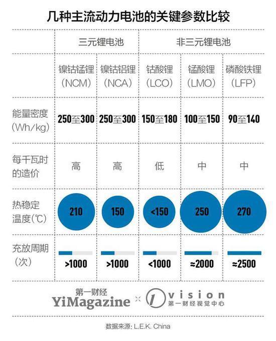 動(dòng)力電池市場(chǎng)目前最常見(jiàn)的兩類(lèi)解決方案,一是三元鋰電池,二是磷酸鐵鋰電池。兩者間的主要差異在于電芯正極材料所用的合金——磷酸鐵鋰方案安全性好、成本低,但能量密度不高;三元鋰方案能量密度高、耐低溫,但安全性差、成本高。