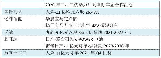 從目前車(chē)企的供應(yīng)鏈看,根據(jù)不同項(xiàng)目、不同車(chē)型,選擇2-4家核心動(dòng)力電池供應(yīng)商是市場(chǎng)的主流趨勢(shì)。在此背景下,包括億緯鋰能在內(nèi)的二、三線(xiàn)電池廠(chǎng)商,均在2020年進(jìn)入了國(guó)際車(chē)企的供應(yīng)鏈體系。