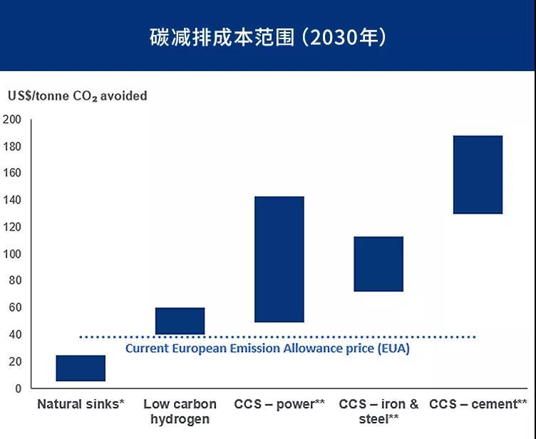 數(shù)據(jù)來源:伍德麥肯茲能源轉(zhuǎn)型服務(wù)。*基于自然的解決方案,例如林業(yè)項(xiàng)目;**電力和工業(yè)領(lǐng)域的CCS假定捕獲率為90%。2021年2月1日起的歐洲排放配額價格(EUA)