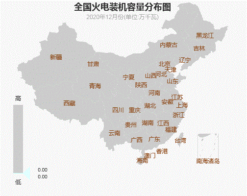2020年,全國(guó)全口徑火電裝機(jī)容量達(dá)124517萬(wàn)千瓦,同比增長(zhǎng)4.7%,占全部裝機(jī)容量的56.58%。其中,煤電裝機(jī)容量為107992萬(wàn)千瓦,同比增長(zhǎng)3.8%,占全部裝機(jī)容量的49.07%,首次降至50%以下;氣電裝機(jī)容量為9802萬(wàn)千瓦,同比增長(zhǎng)8.6%,全部裝機(jī)容量的4.45%。全國(guó)火電裝機(jī)容量分布圖如下所示。