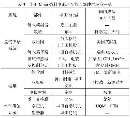 日本在燃料電池汽車方面領(lǐng)先全球,不止在于技術(shù)優(yōu) 勢(shì),還在于其強(qiáng)大的供應(yīng)鏈體系,以豐田 Mirai 燃料電池核 心部件為例,如表 3 所示,其電堆、氫氣供給系統(tǒng)、空氣供 給系統(tǒng)的主要供應(yīng)商基本為本土企業(yè),其中電裝、豐田自動(dòng) 織機(jī)、愛(ài)信精機(jī)、豐田紡織、捷太格特主要供應(yīng)商均為豐田 公司控股企業(yè)。而國(guó)內(nèi)典型客車產(chǎn)品核心部件的供應(yīng)商主要 集中于歐美日等國(guó),國(guó)內(nèi)企業(yè)目前主要從事電堆集成、電堆 系統(tǒng)集成、氫氣供應(yīng)系統(tǒng)集成的工作。