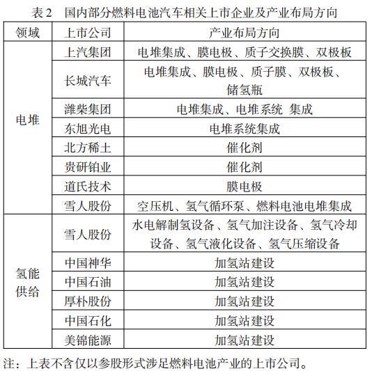 2017 年以來(lái),上汽集團(tuán)、濰柴集團(tuán)、長(zhǎng)城集團(tuán)、雪人 股份等國(guó)內(nèi)大型企業(yè)紛紛調(diào)整業(yè)務(wù)戰(zhàn)略或增加業(yè)務(wù)版塊,快 速布局氫能與氫燃料電池核心零部件產(chǎn)業(yè),其中上市公司超 過(guò) 30 家。大型企業(yè)集團(tuán)進(jìn)入燃料電池核心零部件產(chǎn)業(yè),憑 借資金實(shí)力和渠道優(yōu)勢(shì)以及大規(guī)模的研發(fā)和產(chǎn)業(yè)投入,加速 了產(chǎn)業(yè)鏈的構(gòu)建和集聚,加快了燃料電池汽車國(guó)產(chǎn)重要部件 性能提升和規(guī)模化生產(chǎn)的時(shí)間表。國(guó)內(nèi)部分燃料電池汽車相 關(guān)上市企業(yè)及產(chǎn)業(yè)布局方向如表 2 所示。