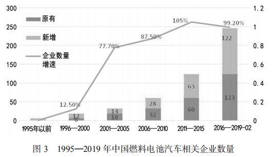 圖 3 給出了 1995—2019 年中國(guó)燃料電池汽車相關(guān)企業(yè) 數(shù)量。截至 2019-02,中國(guó)燃料電池汽車相關(guān)企業(yè)數(shù)量近 250 家,其中近三年來(lái)相關(guān)企業(yè)數(shù)量增速加快,并初步形成了長(zhǎng) 三角、華南及環(huán)京幾大產(chǎn)業(yè)集聚區(qū)。另外,中部、西部、東 北一些電動(dòng)汽車產(chǎn)業(yè)相對(duì)落后,或工業(yè)副產(chǎn)氫以及光電水電 資源較為豐富,以及氣候極寒等地區(qū),也是布局燃料電池汽 車產(chǎn)業(yè)的重要區(qū)域。