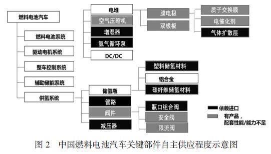 如圖 2 所示,圖中黑色陰影部分的產(chǎn)品是目前國(guó)內(nèi)產(chǎn)業(yè) 空白,完全依賴進(jìn)口的產(chǎn)品,灰色陰影部分代表國(guó)內(nèi)雖然有 相應(yīng)產(chǎn)品,但由于性能不足或車標(biāo)配套能力不足,目前階段 也主要依賴于進(jìn)口的領(lǐng)域,在燃料電池汽車核心部件方面, 中國(guó)目前主要掌握的是電堆和電堆系統(tǒng)的集成、車載儲(chǔ)氫瓶 的集成。