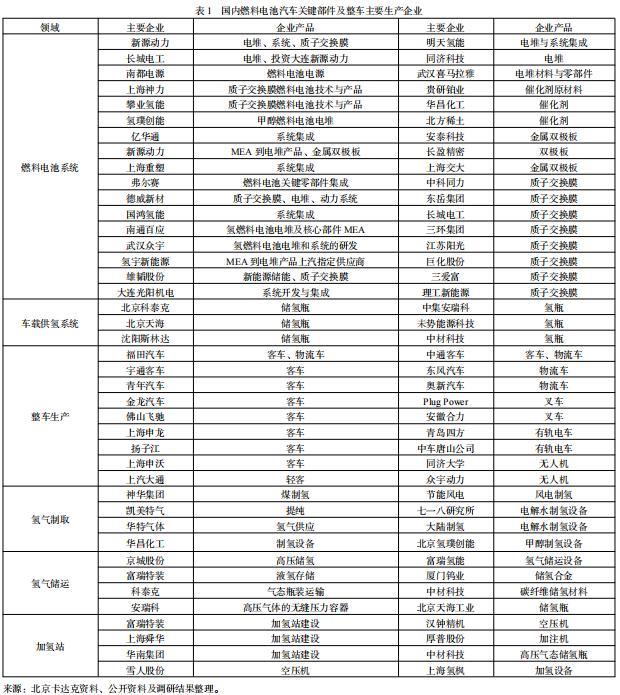 燃料電池汽車產(chǎn)業(yè)鏈內(nèi),已經(jīng)集聚了數(shù)量較多的國(guó)內(nèi)生 產(chǎn)企業(yè)。國(guó)內(nèi)燃料電池汽車關(guān)鍵部件及整車主要生產(chǎn)企業(yè)如表 1 所示。