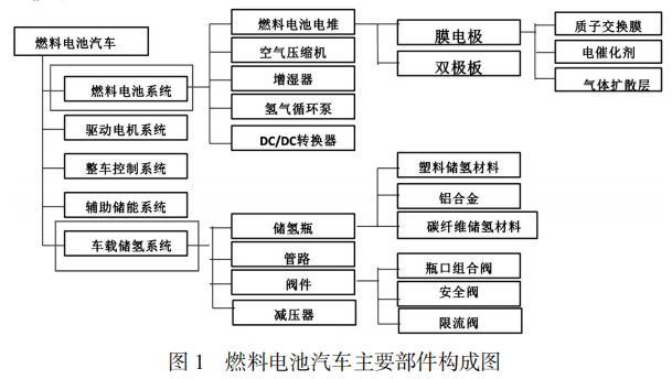燃料電池汽車產(chǎn)業(yè)鏈主要包含上游(燃料電池動(dòng)力系統(tǒng) 及關(guān)鍵部件)和下游(整車生產(chǎn))兩大部分。與傳統(tǒng)汽車產(chǎn) 業(yè)鏈相比,燃料電池汽車產(chǎn)業(yè)鏈主要新增了燃料電池系統(tǒng)和 車載供氫系統(tǒng),其中燃料電池系統(tǒng)是核心結(jié)構(gòu)。主要部件構(gòu) 成如圖 1 所示。