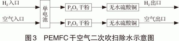 羅馬吉[28]等提出了干空氣二次吹掃除水的冷啟動(dòng)策略,同時(shí)通過(guò)實(shí)驗(yàn)得到吹掃除水后質(zhì)子交換膜燃料電池的水含量,內(nèi)阻的變化及其冷啟動(dòng)性能,干空氣二次吹掃除水系統(tǒng)如圖3所示。實(shí)驗(yàn)結(jié)果顯示,通過(guò)吹掃除水可以在較短時(shí)間內(nèi)有效除水,升高單電池內(nèi)阻,并且不會(huì)產(chǎn)生無(wú)法修復(fù)的損傷,因此,單個(gè)燃料電池從-10℃成功啟動(dòng)可以利用干空氣進(jìn)行二次吹掃除水完成。Sung Il Kim[29]等在冷啟動(dòng)過(guò)程中采用陰極側(cè)通氫的方法凈化PEMFC,實(shí)驗(yàn)結(jié)果表明,PEMFC清洗性能得到提高,加氫凈化法可以有效去除陰極的水,使PEMFC的冷啟動(dòng)性能得到改善。