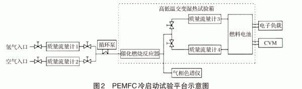 相比于傳統(tǒng)的輔助供熱方法,氫氧燃燒輔助供熱具有更多優(yōu)點(diǎn),能夠滿(mǎn)足燃料電池的低溫啟動(dòng)要求。QianGuo[22]等采用陽(yáng)極氫氧催化反應(yīng)輔助實(shí)現(xiàn)PEMFC從-20℃啟動(dòng),其通過(guò)建立氫氧催化反應(yīng)三維多相冷啟動(dòng)模型進(jìn)行研究。研究結(jié)果表明,電極的加熱位置對(duì)催化反應(yīng)沒(méi)有顯著影響,啟動(dòng)電流密度應(yīng)該適中,同時(shí)由于氫氧催化反應(yīng),陽(yáng)極的加濕性降低了膜的歐姆電勢(shì),致使冷啟動(dòng)性能提高。Yueqi Luo[23]等研究了陰極和陽(yáng)極氫氧催化反應(yīng)在催化劑層(CL)通過(guò)鉑催化劑進(jìn)行低溫反應(yīng)輔助PEMFC冷啟動(dòng),結(jié)果表明,在最大功率模式下,且陽(yáng)極中空氣摩爾分?jǐn)?shù)應(yīng)高于16%,陽(yáng)極催化反應(yīng)能實(shí)現(xiàn)PEMFC從-25℃冷啟動(dòng)13s內(nèi)完成, 陰極催化反應(yīng)無(wú)法實(shí)現(xiàn)從-25℃啟動(dòng) ;陽(yáng)極催化反應(yīng)在催化層中產(chǎn)生多余的水,陽(yáng)極的水加濕可以降低膜電極的電阻,從而提高功率輸出,陰極催化反應(yīng)在陰極催化劑中也會(huì)產(chǎn)生水會(huì)增加冰的形成速率,導(dǎo)致冷啟動(dòng)過(guò)程的失敗;在冷啟動(dòng)過(guò)程中,陽(yáng)極催化反應(yīng)的熱生成速率增加。然而對(duì)于陰極催化反應(yīng),熱生成速率降低。與上述2者在膜電極燃燒供熱不同,鄭俊生[24]等為了實(shí)現(xiàn)質(zhì)子交換膜燃料電池的冷啟動(dòng),提出了一種把氫氣和空氣預(yù)混合氣體催化燃燒,然后利用尾氣進(jìn)行輔助供熱的低溫啟動(dòng)策略,在此基礎(chǔ)上,采用試驗(yàn)臺(tái)進(jìn)行研究,冷啟動(dòng)試驗(yàn)臺(tái)如圖2所示。