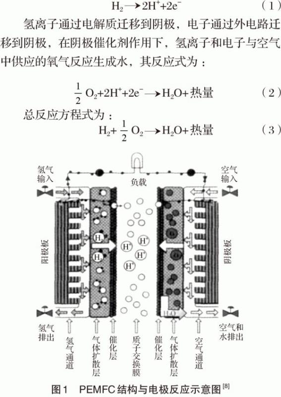 PEMFC電池主要由質(zhì)子交換膜、雙極板和電極(陰極和陽(yáng)極)組成。其中質(zhì)子交換膜、陽(yáng)極和陰極組合成膜電極裝置(MEA),它是PEMFC的關(guān)鍵部件。此外,PEMFC還包括催化層、氣體擴(kuò)散層和氣體通道等結(jié)構(gòu)[6],冷啟動(dòng)過(guò)程中可能會(huì)造成MEA損傷和催化層結(jié)構(gòu)改變等問(wèn)題[7],致使燃料電池冷啟動(dòng)失敗,PEMFC的工作原理如圖1所示。