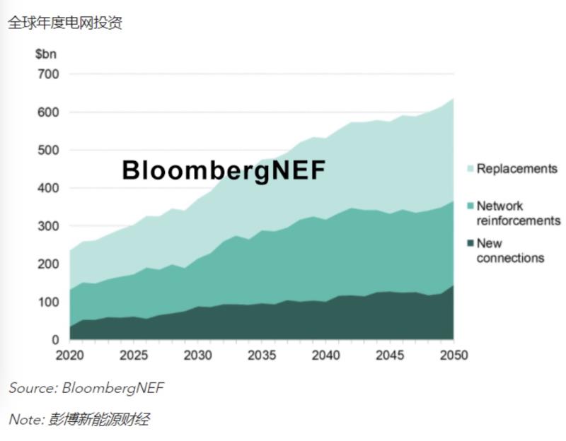 2020年,電網(wǎng)投資約為2350億美元,到2050年,電網(wǎng)投資需增至6360億美元,支撐電源建設,滿足新增用電需求,并替換現(xiàn)有基礎設施。