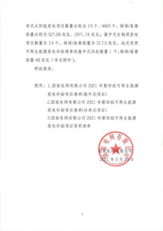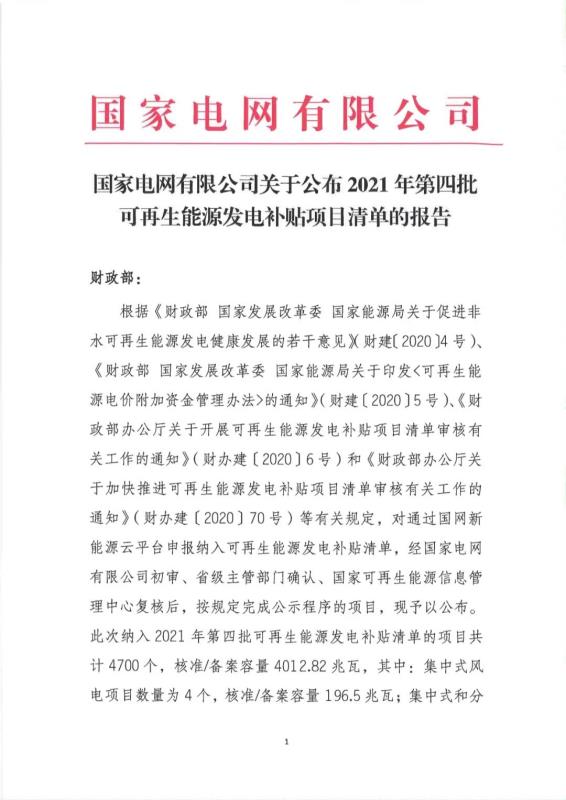 關(guān)于公布2021年第四批可再生能源發(fā)電補(bǔ)貼項(xiàng)目清單的公告