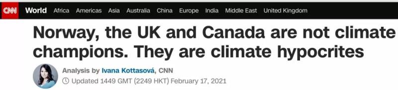 美國(guó)有線電視新聞網(wǎng)(CNN)發(fā)表伊萬(wàn)娜·科塔索娃(Ivana Kottasová)的分析Norway, the UK and Canada are not climate champions. They are climate hypocrites(挪威、英國(guó)和加拿大不是氣候冠軍,是偽君子)。
