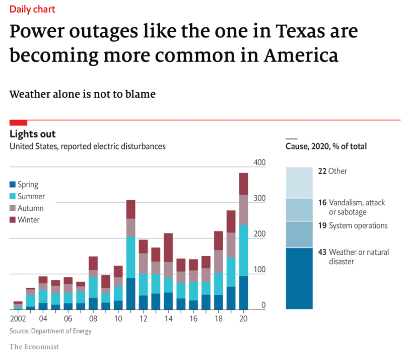 當時,一場冬季風暴導(dǎo)致全州斷電,數(shù)百萬德克薩斯人陷入黑暗??藗愋け娮h員警告說:“這引起了人們對極端天氣下依賴可再生能源的電網(wǎng)可靠性的嚴重擔憂?!?盡管克倫肖先生單挑可再生能源是錯誤的,因為天然氣管道、核反應(yīng)堆和輸電線路在風暴期間也結(jié)冰了,但是他對美國電網(wǎng)的擔憂是合理的。在美國,停電的情況越來越多,也不能光是怪罪于天氣。